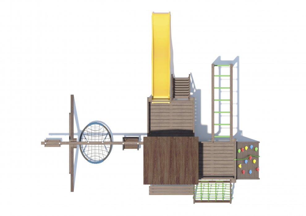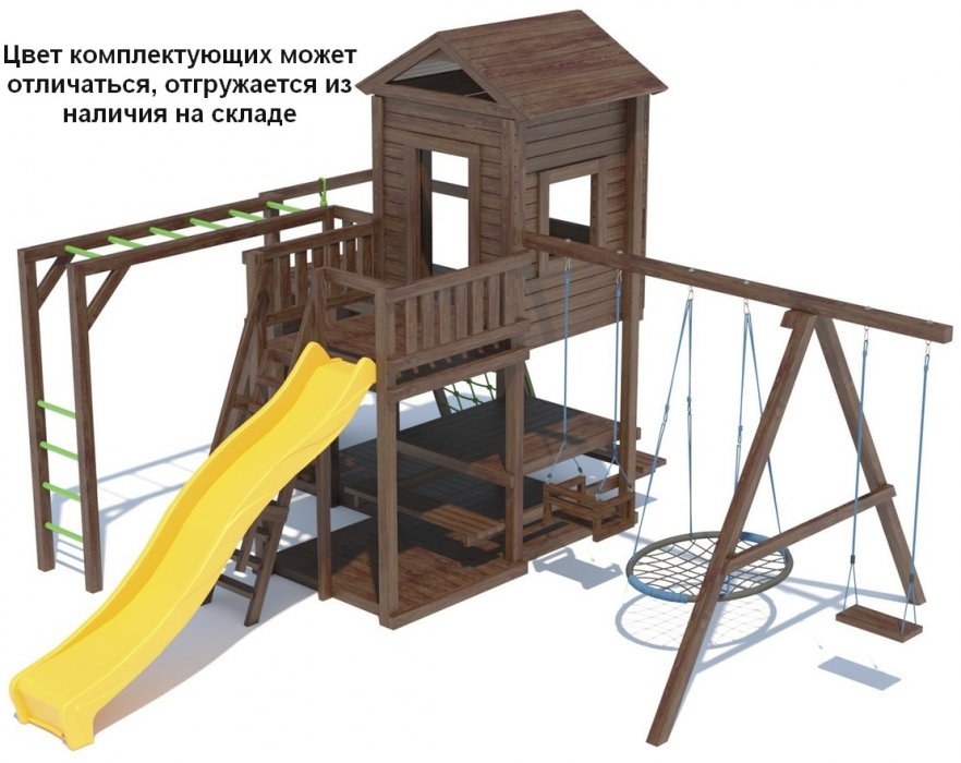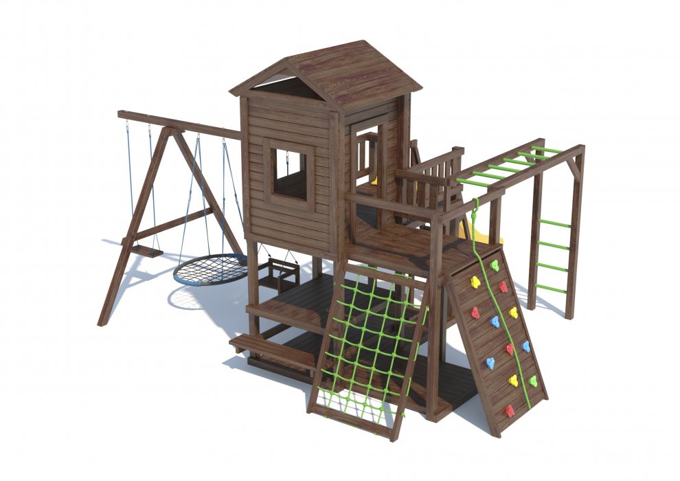Основа детской игровой - спортивной конструкции - башня с террасой и игровой платформой. Конструкция оснащена двускатной деревянной крышей, встроенным домиком в верхней части конструкции, дополнительной платформой в основании конструкции и встроенным столиком с лавками в нижней части конструкции, пластиковым волнообразным скатом с превосходной скользящей поверхностью, деревянной лестницей, широким скалодромом, канатной лестницей, деревянным рукоходом, приставными качелями, сидением качели «гнездо», сидением качели «малютка», сидением качели. Для безопасности ребенка предусмотрены перила на лестнице, заборчики и ограждения над зонами препятствий (скалодром, канатная лестница, скат).