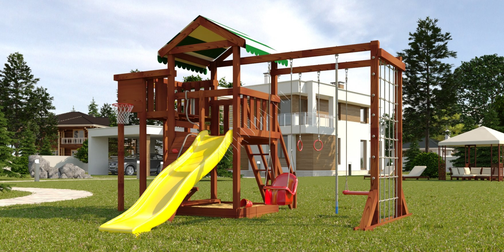 В основе натуральный материал – клееный брус 75х75 мм, который не меняет геометрию со временем, не скрипит и не рассыхается. Конструкция и элементы качельных подвесов разработаны и произведены согласно ГОСТ.