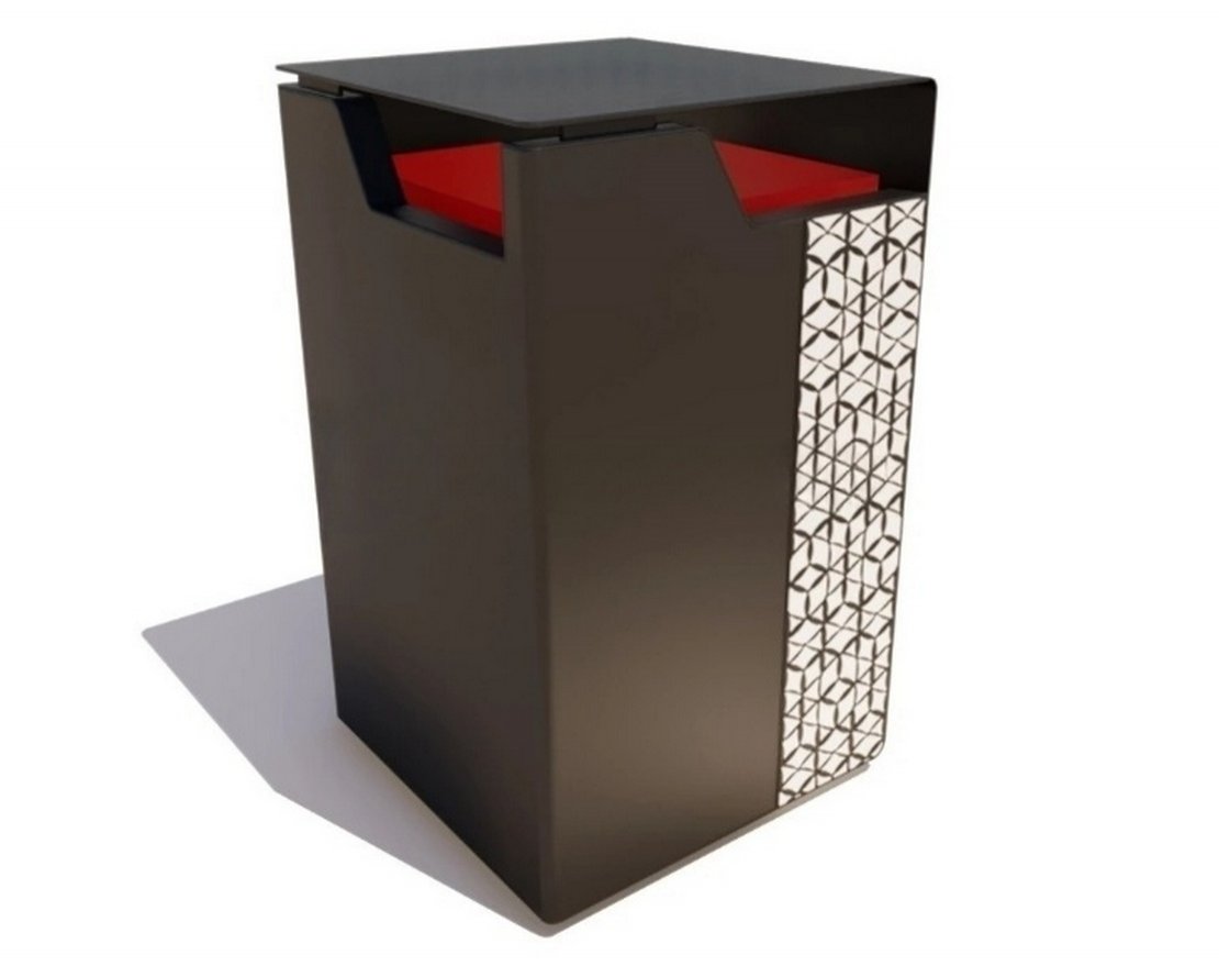 Уличная урна «Концепт» выполнена в стиле хай-тек. Внешняя сторона покрашена полимерной краской. Цвет покрытия можно изменить. Центральным элементом декора является геометрический узор, выполненный флуоресцентным порошком. В темноте он светится, обозначая место для утилизации отходов.